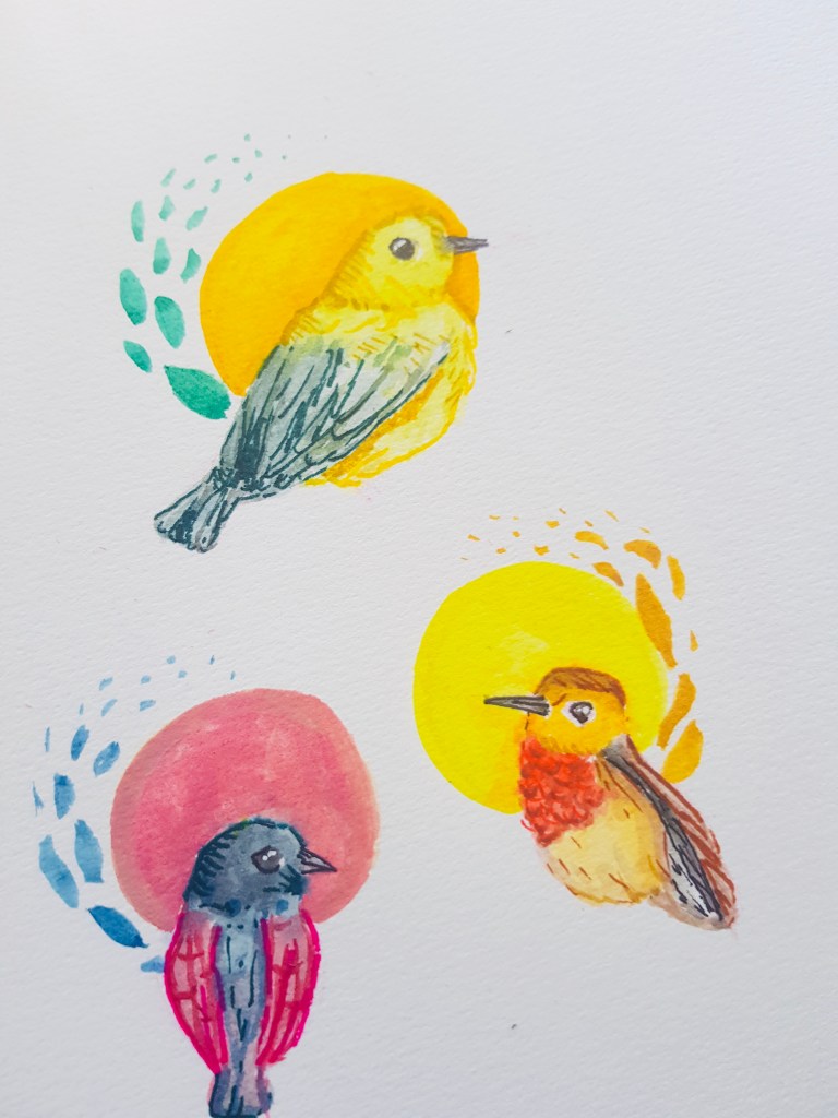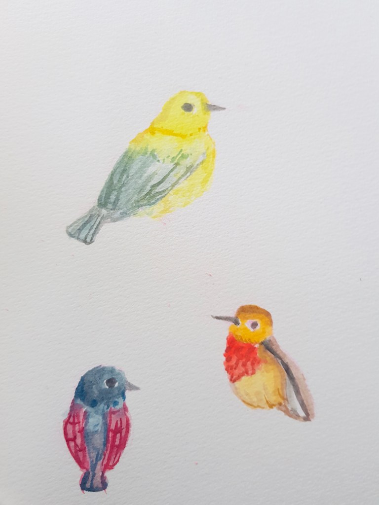 2. Before painting, I lightly erase the sketches so that it doesnāt show up in the end result. I paint the birds using my ā Sakura Koi Watercolors Pocket Field Sketch Box -12ā… yes, it has a very long name. I use a reference photo for drawing them and I usually donāt match the colors that well. For me,it doesnāt have to be exactly the same… it just has to look like a bird. And so does the colors; you donāt have to match them perfectly, just paint with the colors you think is best for youāre painting.